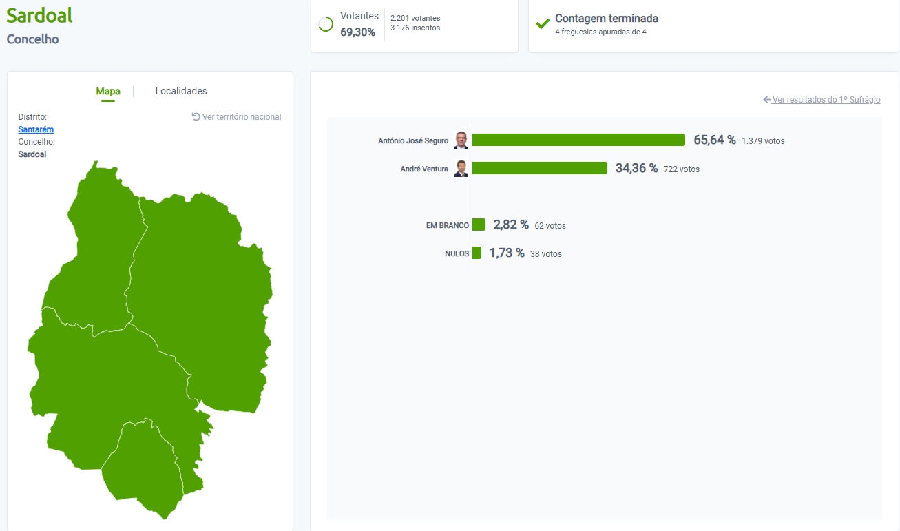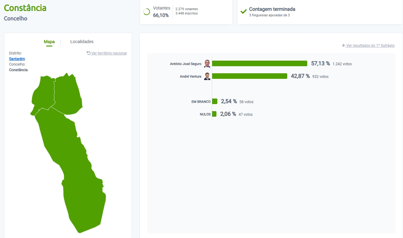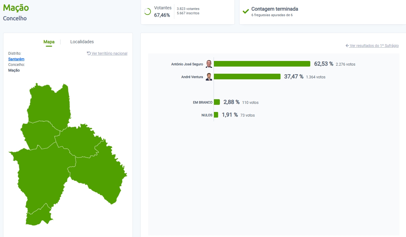 No concelho de Abrantes Ventura tinha vencido na primeira volta com 5.736 votos (30,09%) subiu para 7.391 votos (41,06 %).
