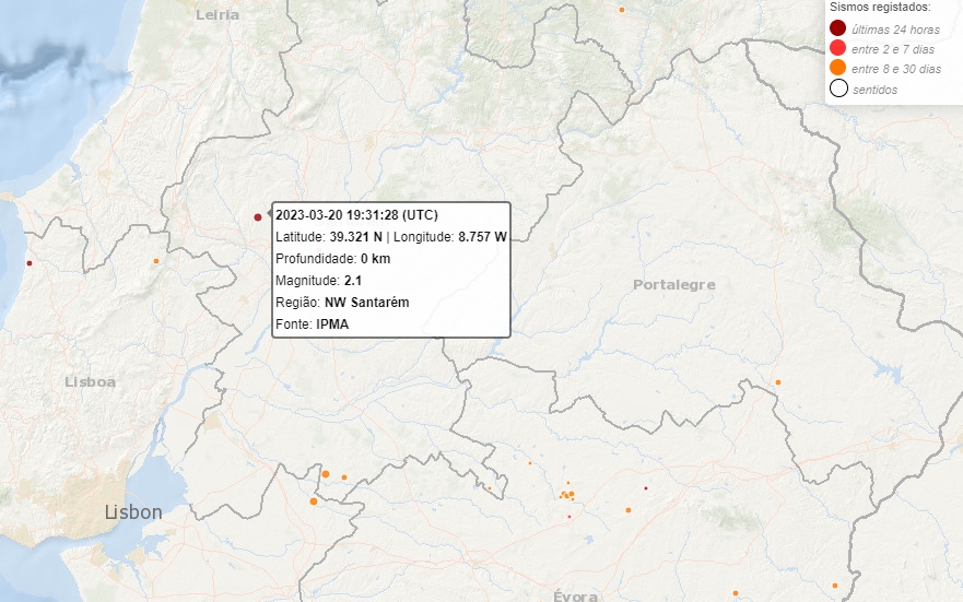 A rede de sismógrafos do Instituto Português do Mar e da Atmosfera (IPMA) registou ao início da noite desta segunda-feira, 20 de março, nas proximidades de Santarém um sismo.