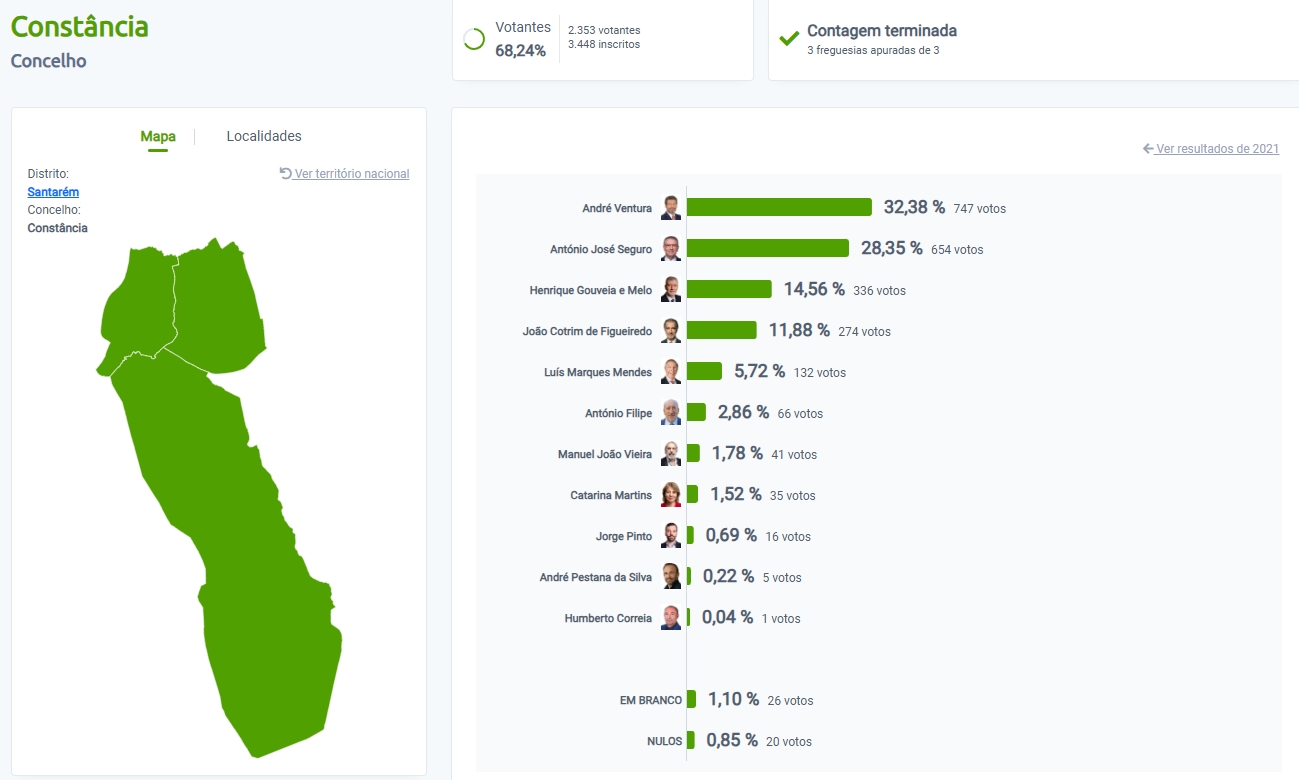 Em Constância a vitória cai para André Ventura. O candidato do Chega vence em Montalvo e Santa Margarida, mas em Constância, freguesia, a vitória é de Seguro.