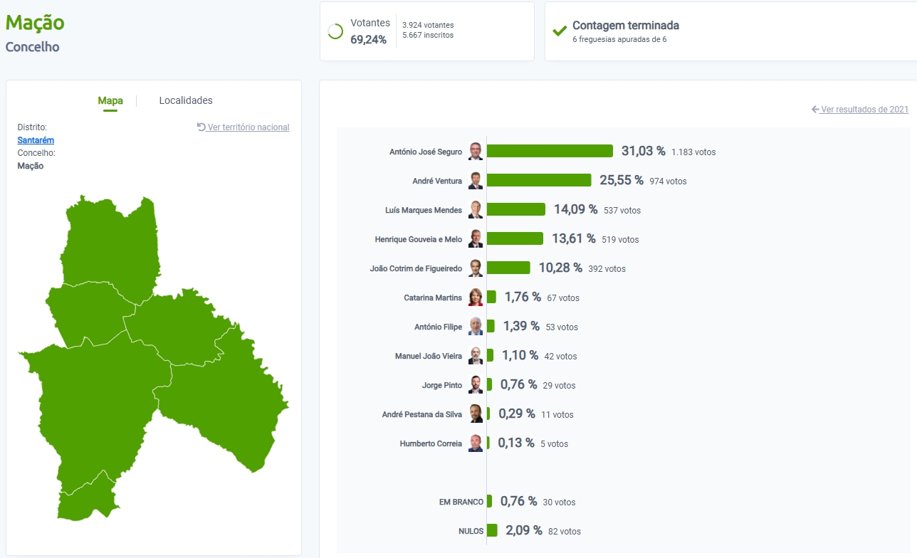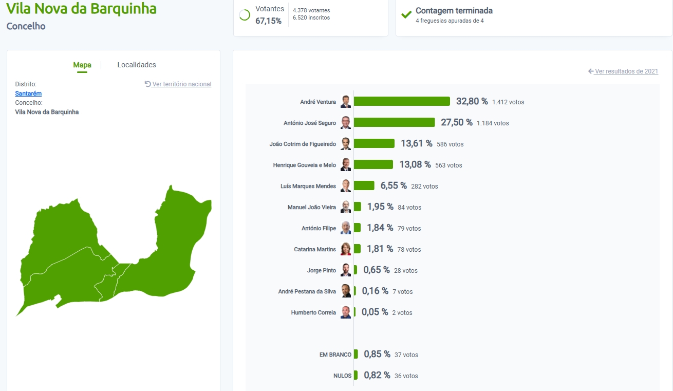 Comecemos por Abrantes. André Ventura ganha o concelho e nas freguesias de Carvalhal, Martinchel, União de Aldeia do Mato e Souto, Rio de Moinhos, União de Alvega e Concavada, Bemposta e União de S. Miguel e Rossio.