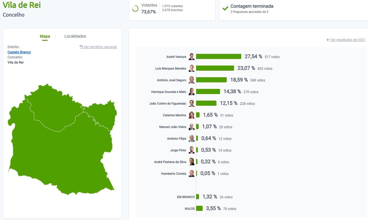 Em Vila de Rei a surpresa com a vitória de André Ventura e com António José Seguro em segundo lugar. Já nas freguesias Marques Mendes ganha numa única freguesia, na Fundada, com Ventura a liderar os votos em Vila de Rei e S. João do Peso.