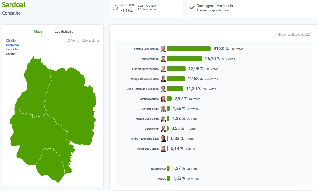 Em Sardoal a vitória é de António José Seguro com mais votos nas freguesias de Alcaravela, Sardoal e Valhascos. André Ventura ganha na freguesia de Santiago de Montalegre.