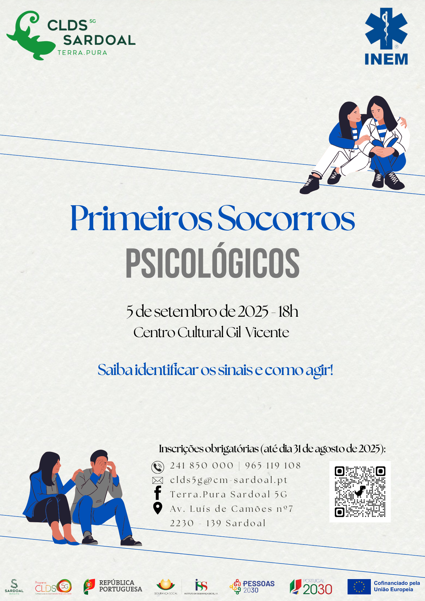 No âmbito da atividade de Desenvolvimento social, capacitação comunitária e intervenção em contextos de emergência social e de cenários de exceção, que visa dotar a população de conhecimentos específicos sobre os contextos de emergência e procedimentos necessários a nível dos primeiros socorros, o Terra.Pura Sardoal 5G irá promover uma sessão sobre “Primeiros Socorros Psicológicos”, que terá como dinamizador o Centro de Apoio Psicológico e Intervenção em Crise do Instituto Nacional de Emergência Médica (INEM).