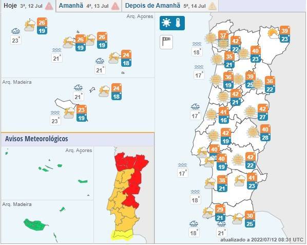 O aviso vermelho, emitido pelo Instituto Português do Mar e da Atmosfera (IPMA), devido à persistência de valores extremamente elevados da temperatura máxima, vai estar em vigor até às 18:00 de quarta-feira, passando depois a laranja.