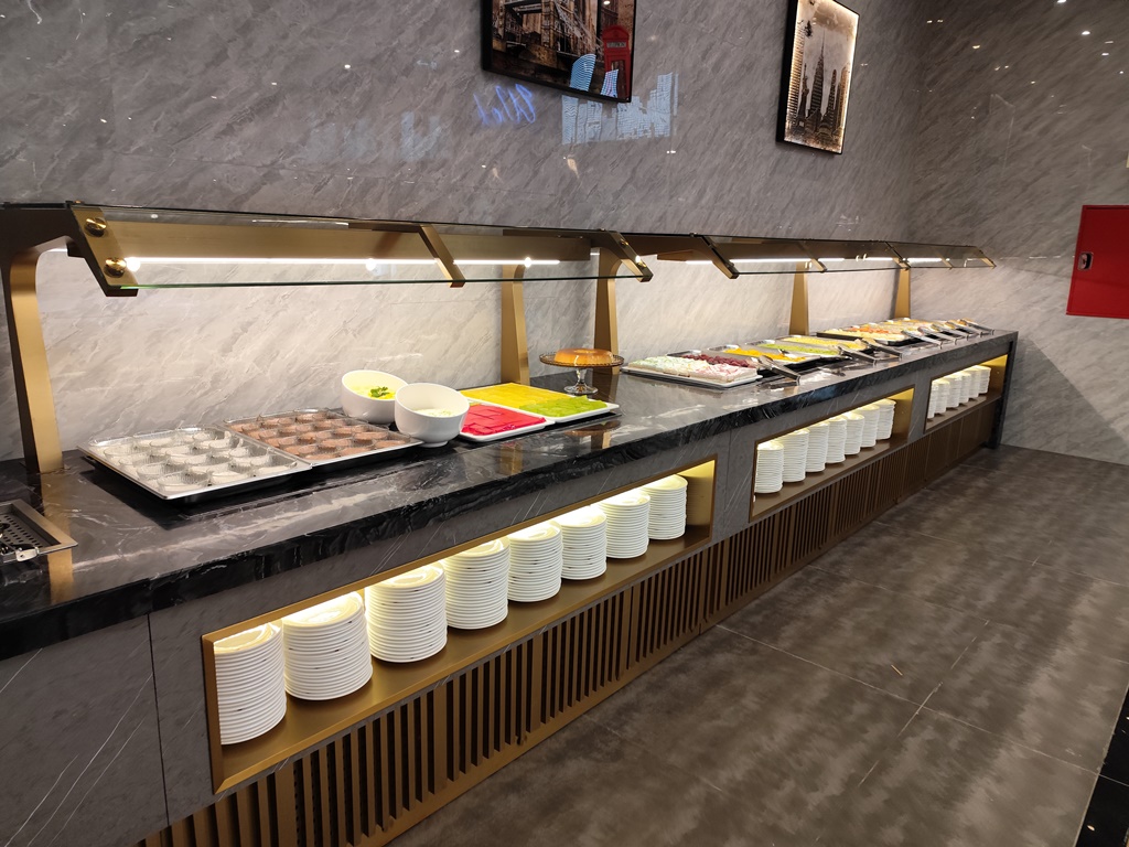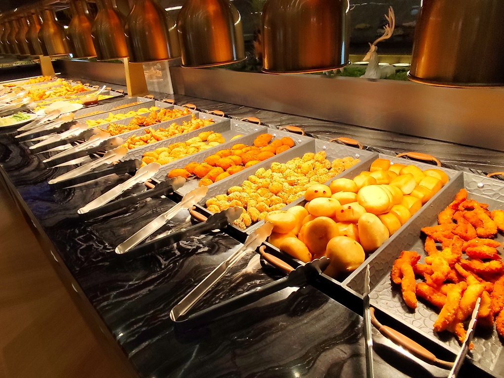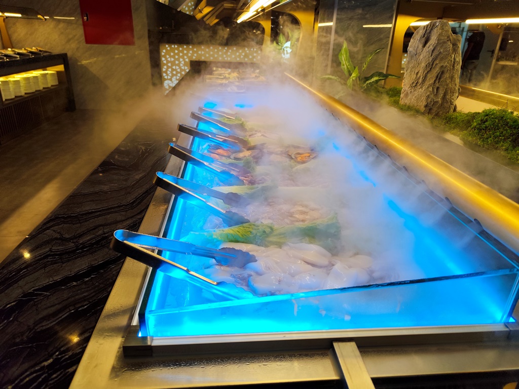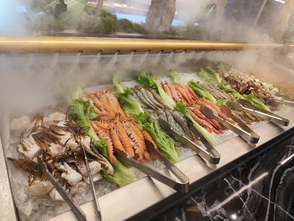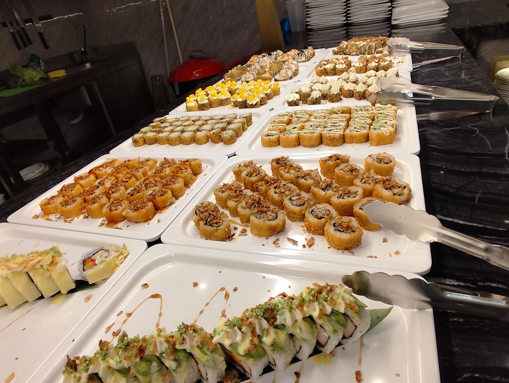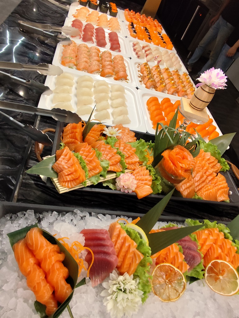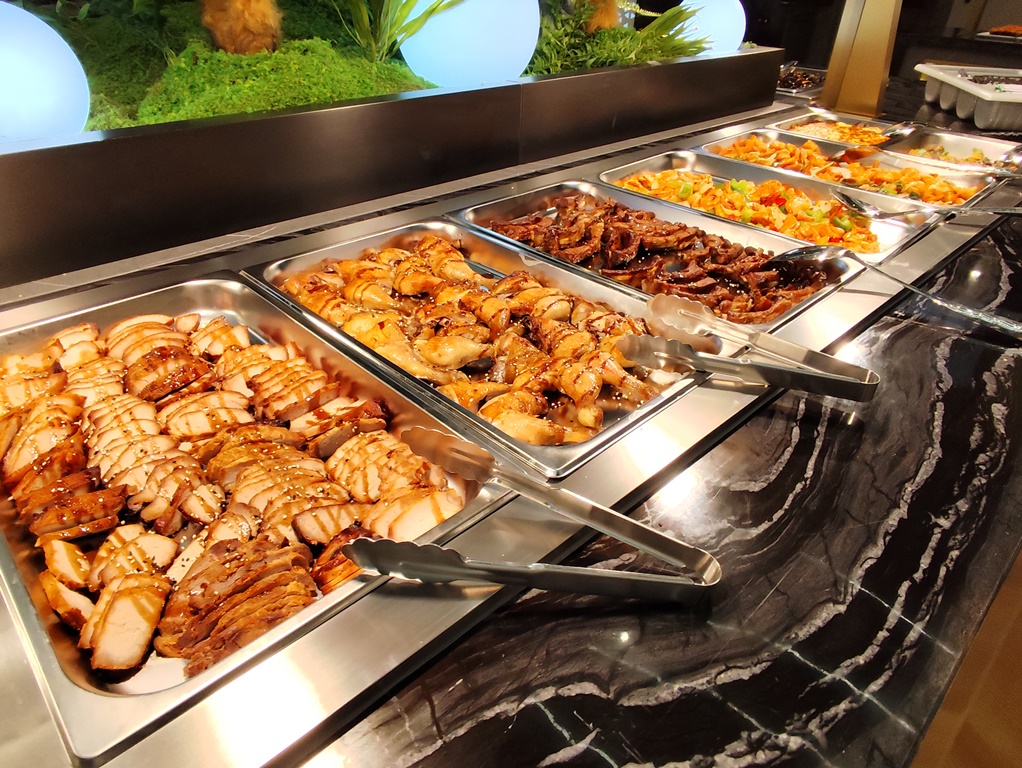 O serviço é feito em buffet. E as escolhas são variadas. Entre carne, peixe ou marisco fresco para grelhar na hora, passando pelas massas e arroz chinês, assim como os pratos de cozinha. Passando por um leque de fritos, de entradas portuguesas (queijos e enchidos) ou carne grelhada, junta-se uma oferta variada de sushi.