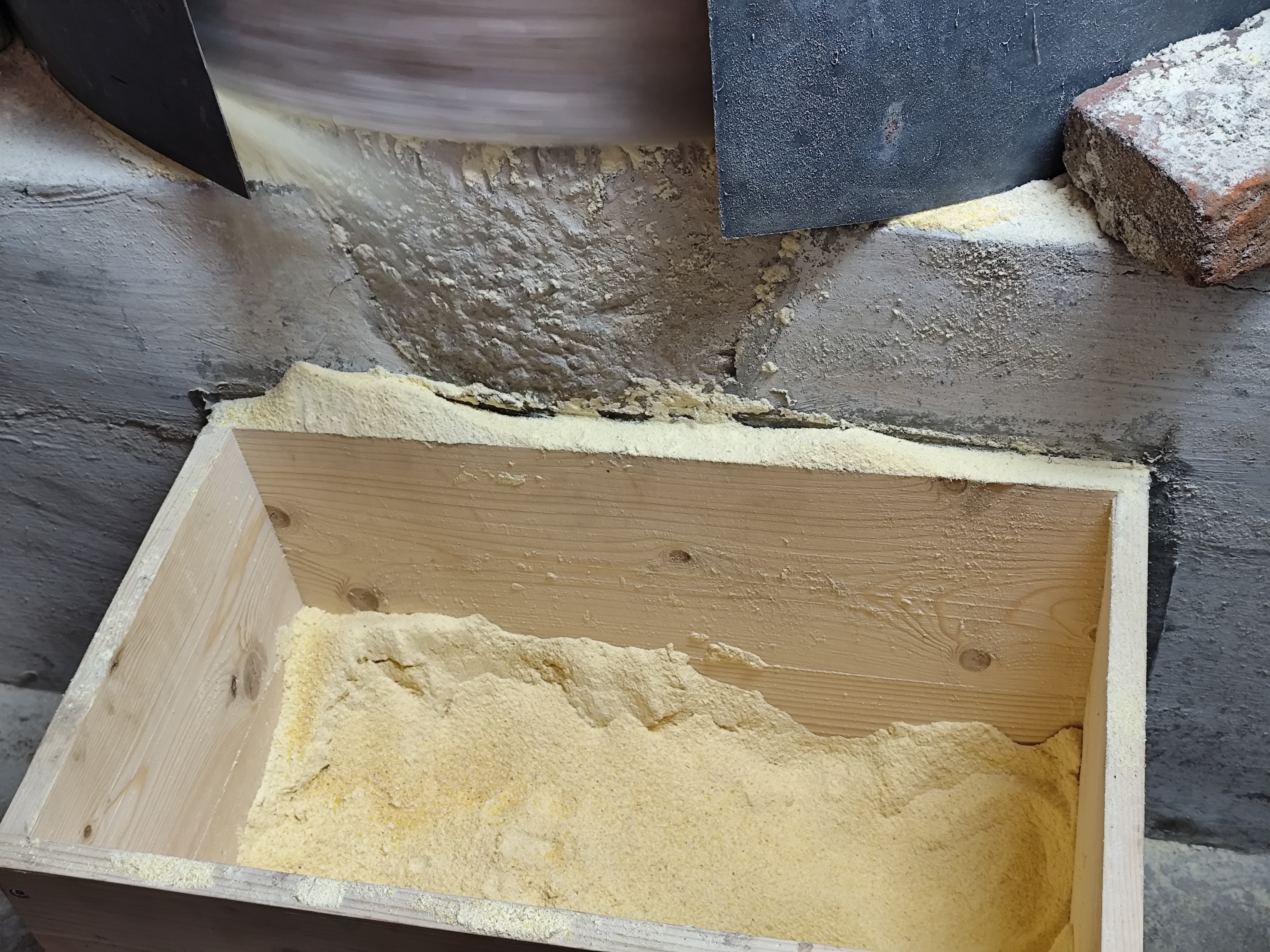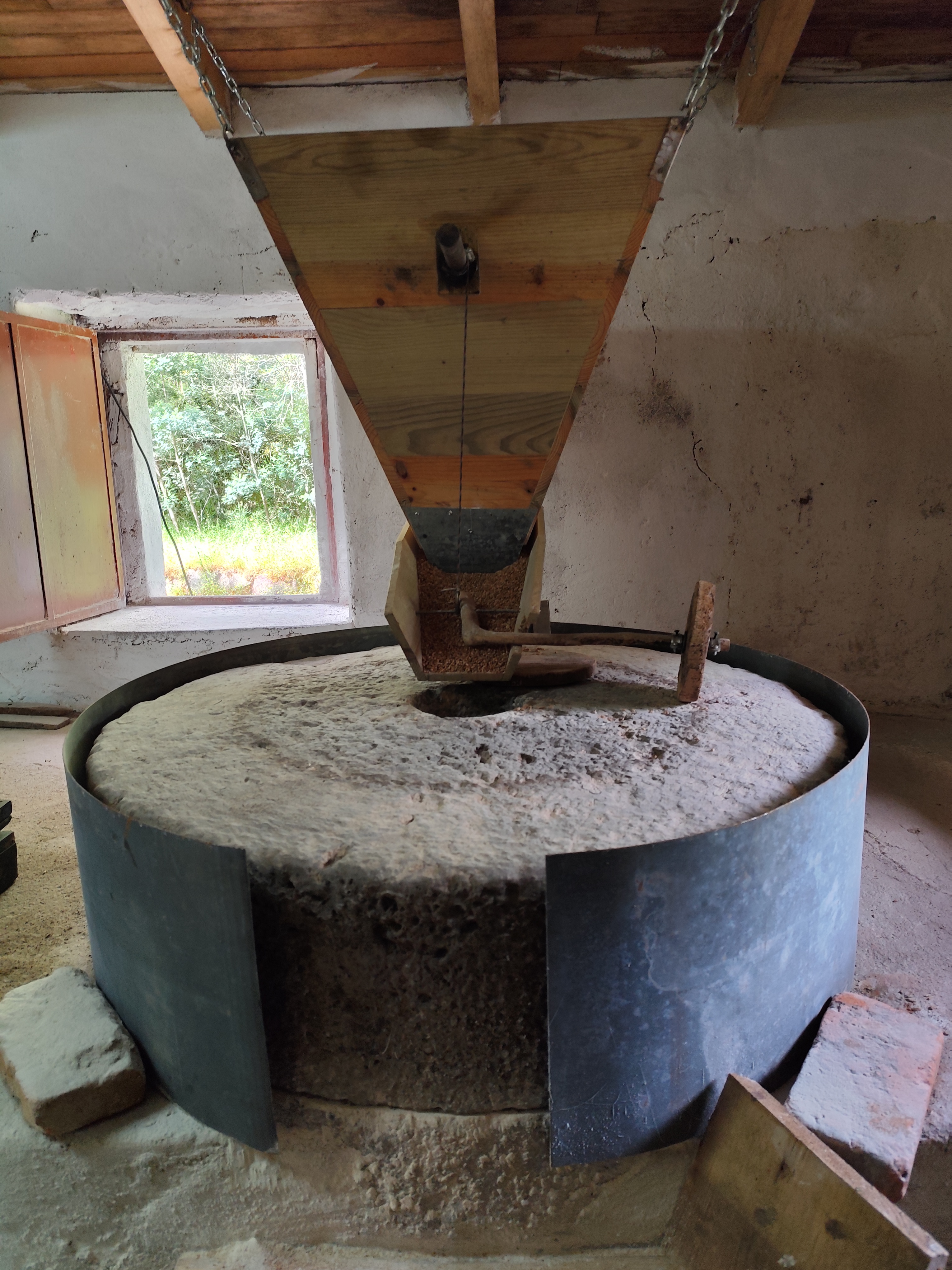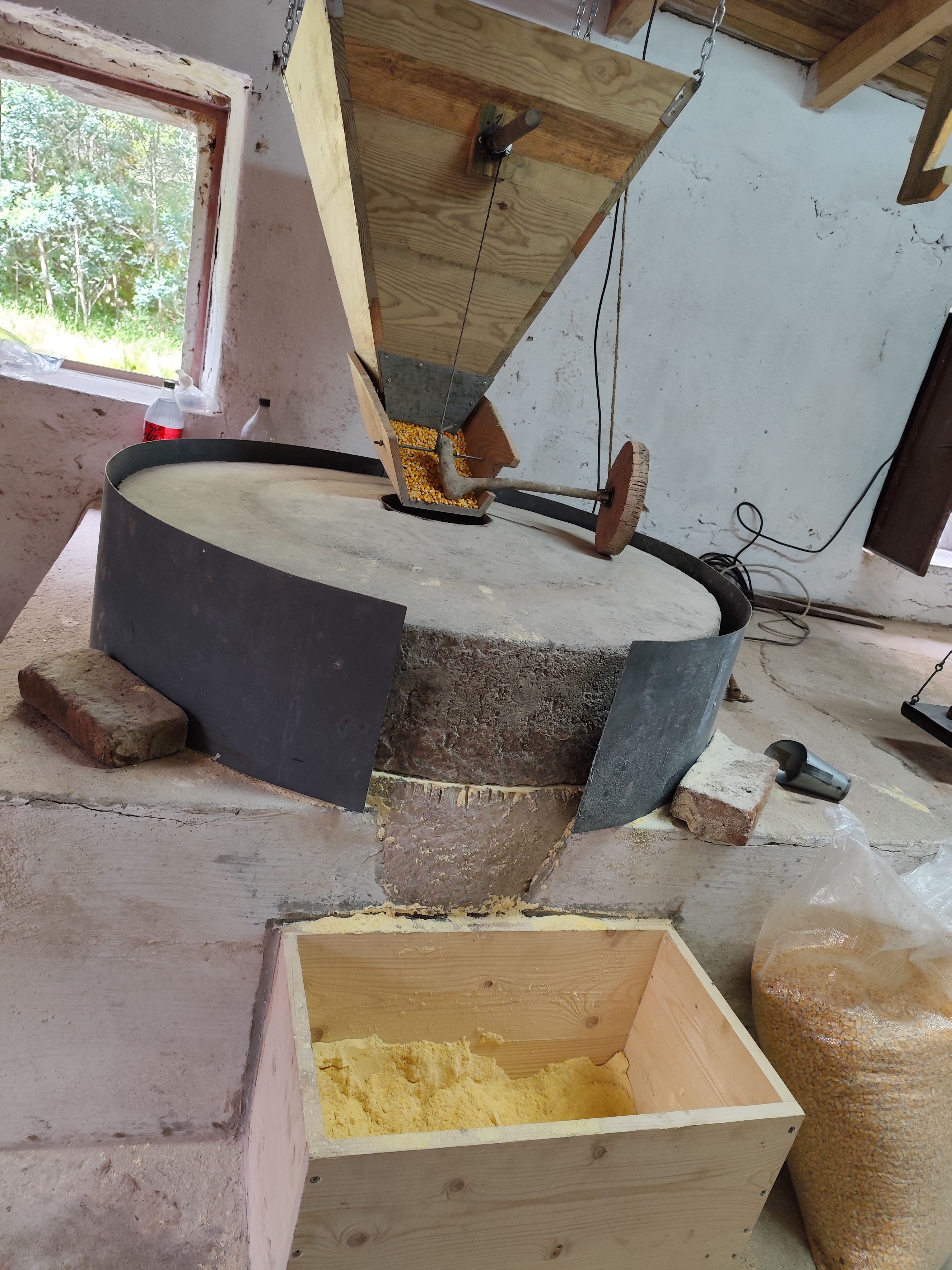 É lógico que as farinhas eram mais grossas, até para que não existisse um desgaste rápido das pedras a rodarem para esmagar os grãos que vão caindo numa cadência lenta para serem pisados pelas pedras.