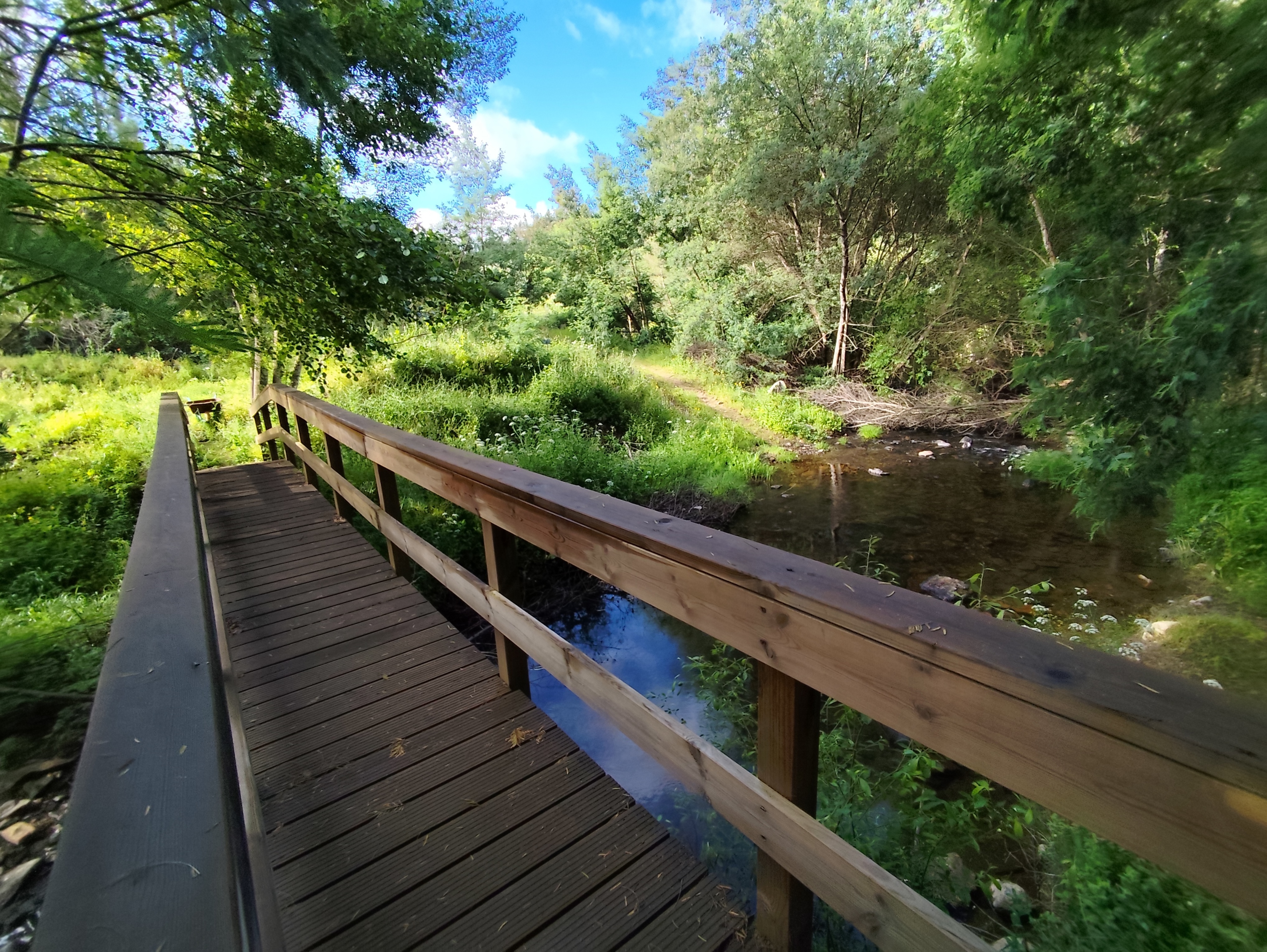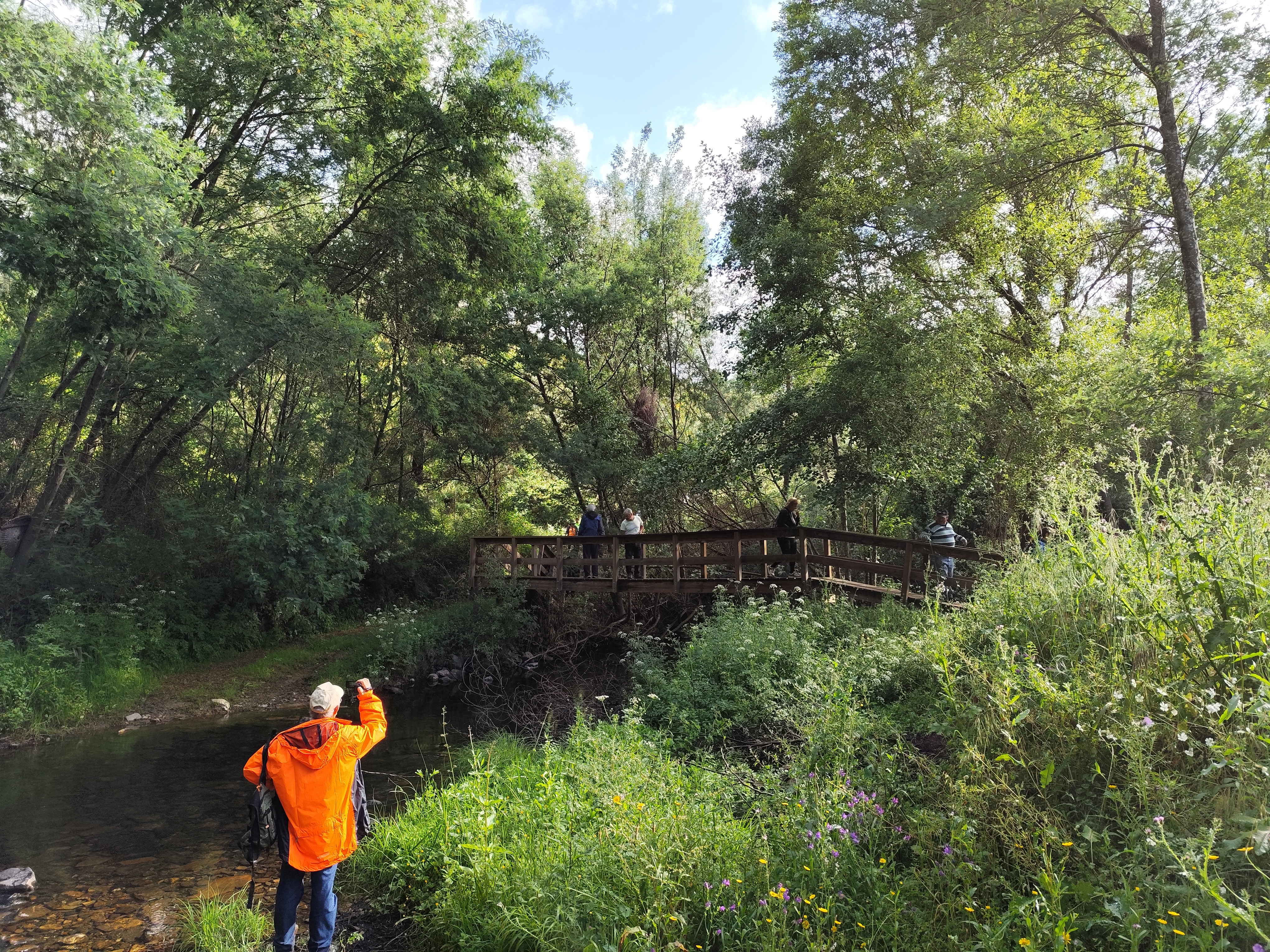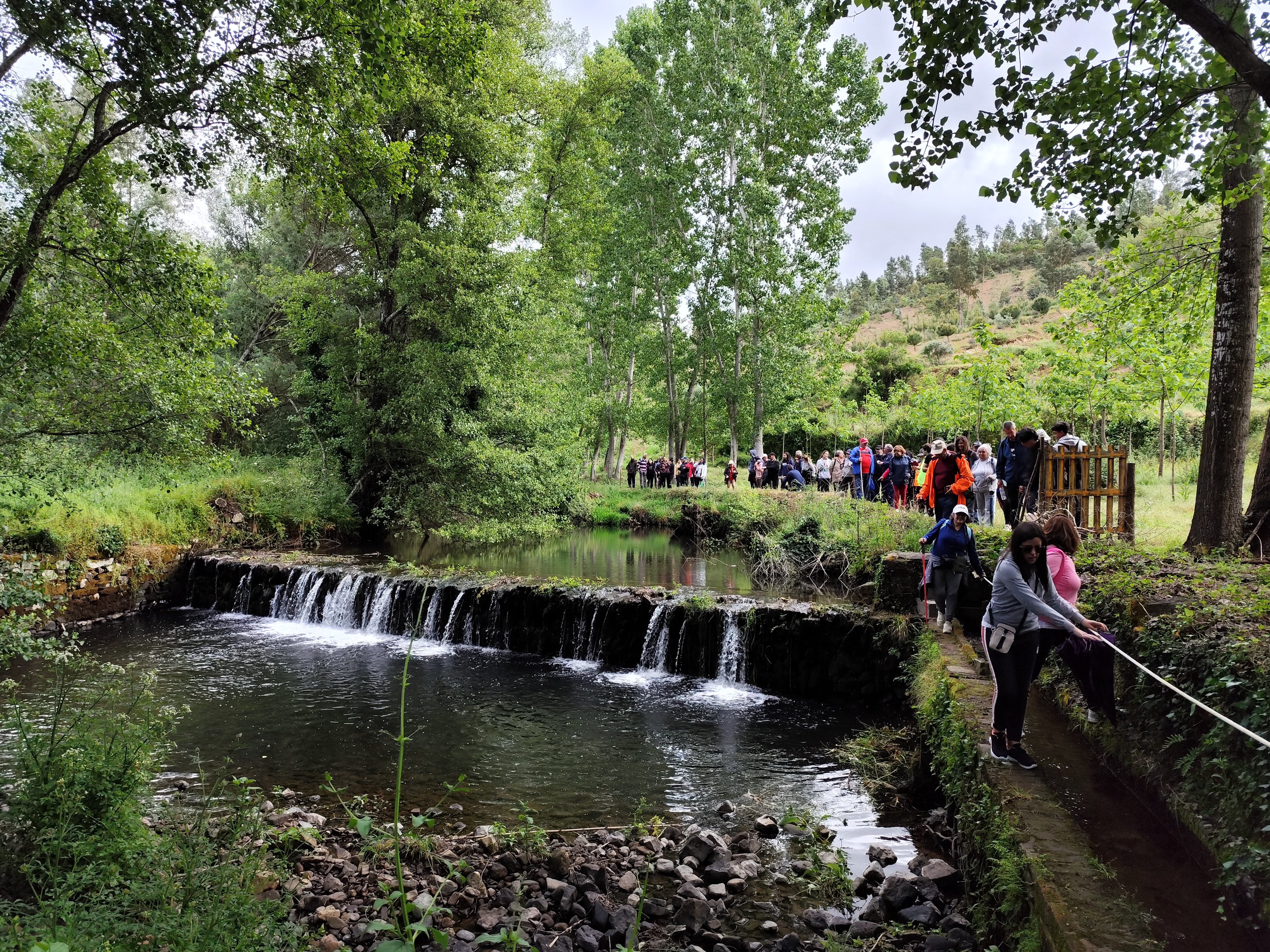 Antes, pouco depois das 8 da manhã, o grupo seguiu caminho fora em direção à ribeira. Aqui e ali os três guias, membros da direção da ACROM, foram explicando por onde se caminhava, destacando um ou outro nome mais curioso, como o pisão bruxo ou o buraco da moura. E nestes cantos pode juntar-se sempre umas lendas ou estórias que foram sendo contadas de avós para netos. A ponte, já muito antiga, sobre a ribeira o grupo entrou em território do concelho de Sardoal para, mais à frente, poder usar uma ponte de madeira e regressar ao concelho de Abrantes. Aqui e ali ouve-se um rouxinol a cantar, na ribeira pode perceber-se a existência de lagostins de água doce e algumas zonas por onde andam os javalis, dizem os mais conhecedores da fauna e da zona.