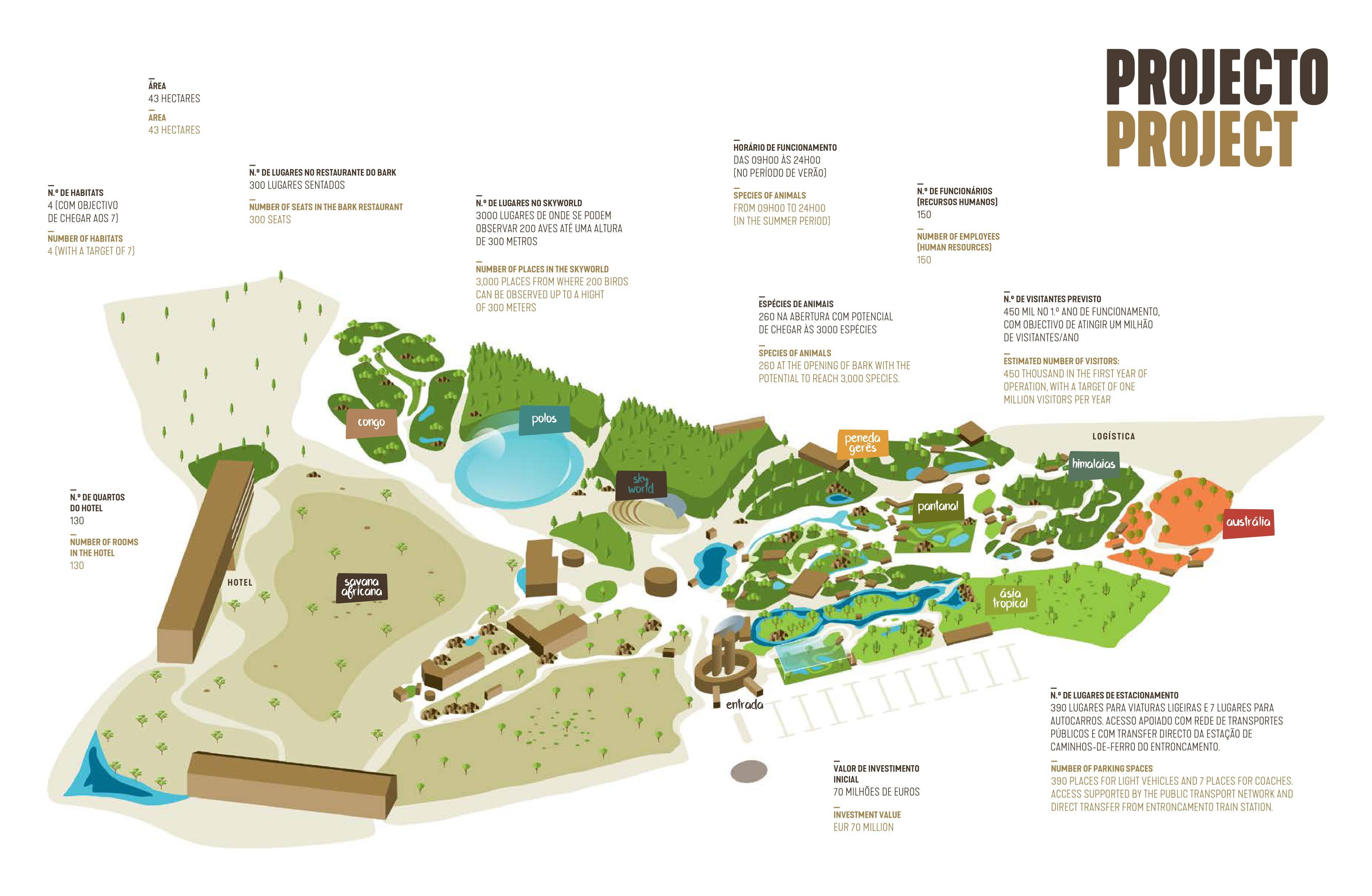 Sendo assim o projeto prevê, que os animais serão distribuídos por 43 hectares de terreno, dividido em quatro habitats representando quatro diferentes regiões mundiais: Ásia tropical, pantanal, Peneda-Gerês e savana africana. Poderemos encontrar neste espaço espécies tão portuguesas como o lince-ibérico, o grifo ou a cabra-montês, como depois o elefante, o leão, a suricata, o dragão de komodo, a cobra-capelo, o jaguar ou a chita.
