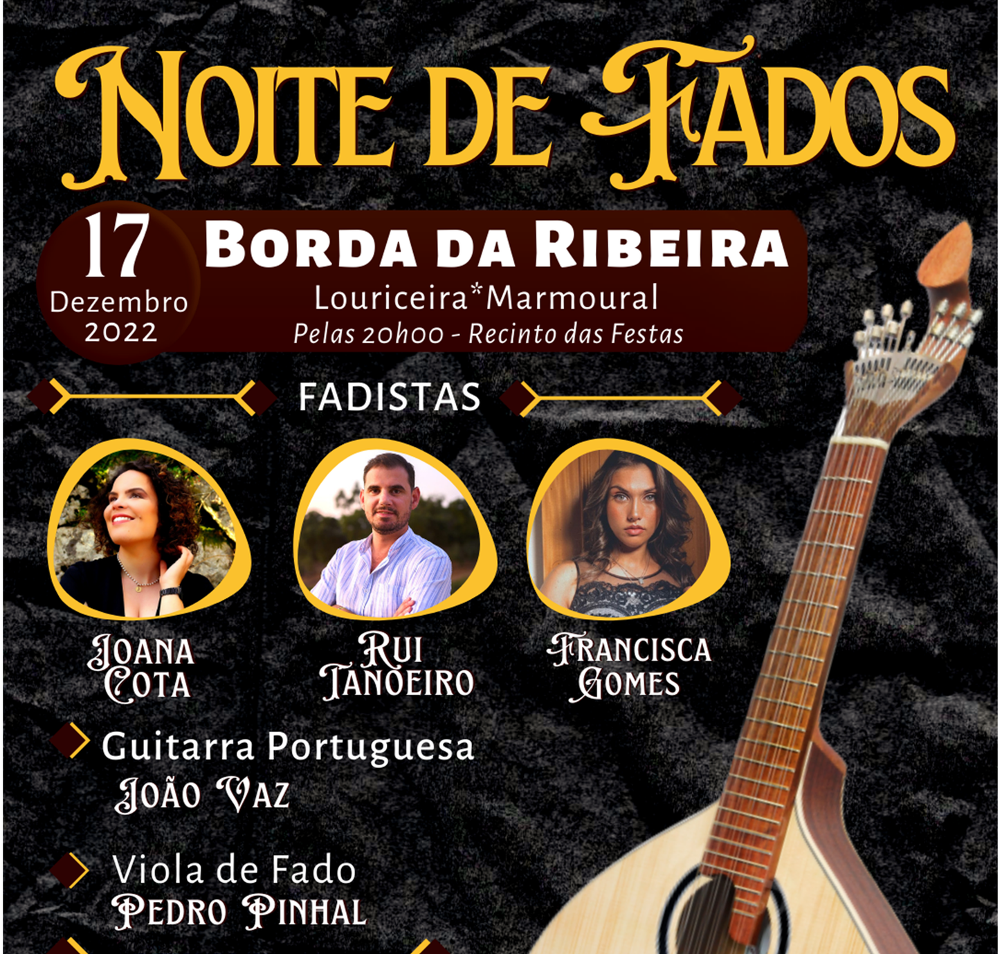 A A.D.R.C. Borda da Ribeira, Louriceira e Marmoural vai organizar, a partir das 20h00 do dia 17 de dezembro, uma noite de fados a decorrer no recinto de festas da aldeia de Borda da Ribeira.