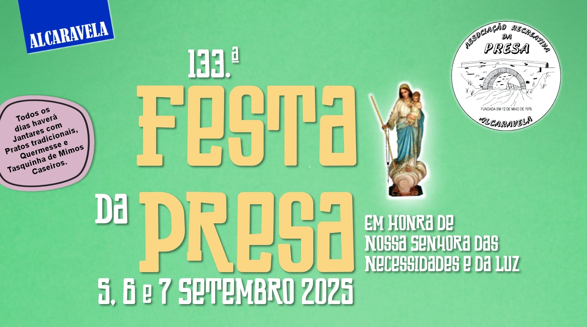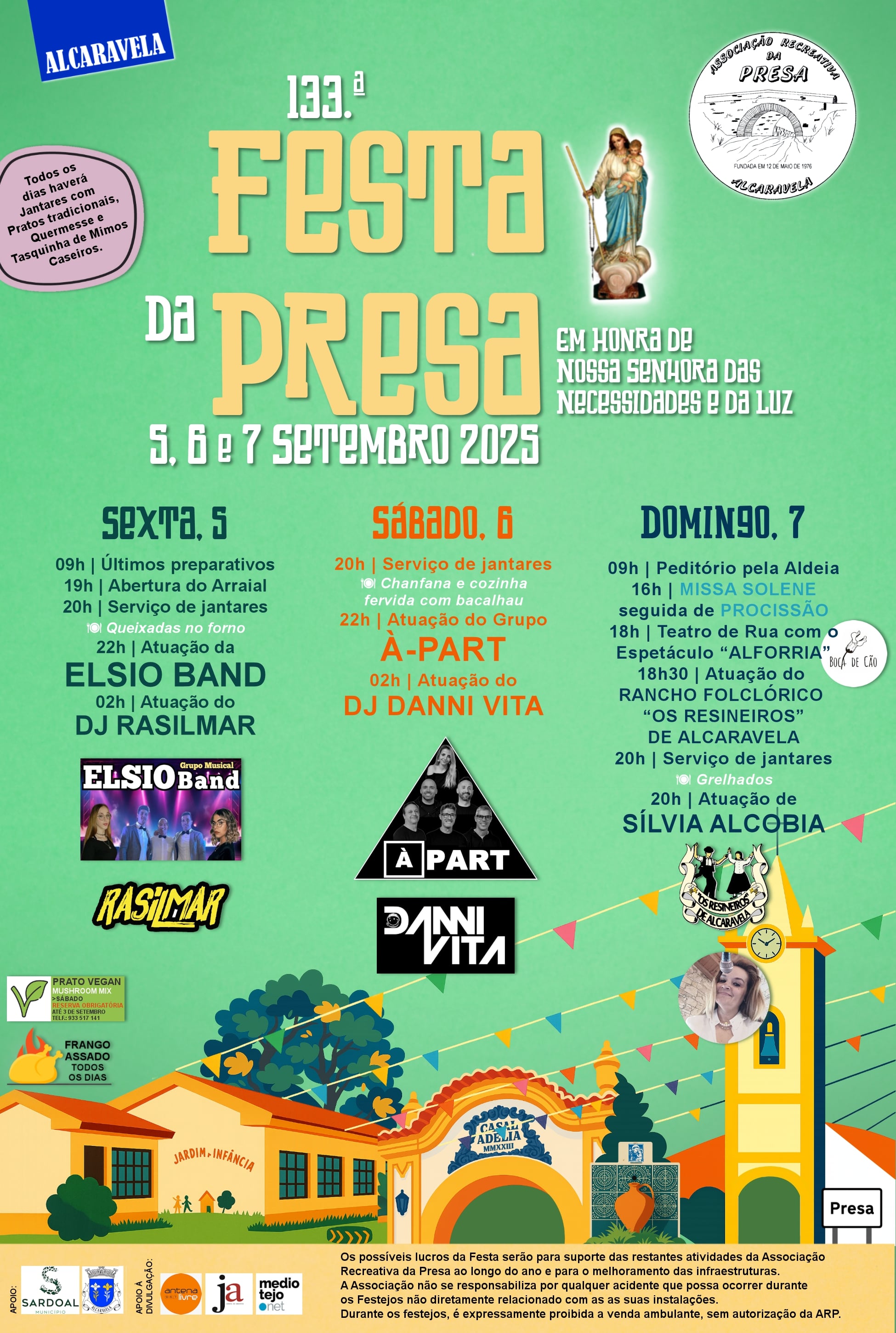 Relativamente à parte gastronómica, para além do frango e grelhados que haverá diariamente, na sexta-feira há “Queixadas no forno” e, no sábado, “Chanfana” e a “Cozinha Fervida”. Há alternativa vegetariana no sábado (Mushroom Mix), sendo que, neste caso, será necessário fazer uma pré-reserva até dia 3 de setembro pelos contactos: telef 933517141, email associacao.presa@sapo.pt ou messenger/facebook.