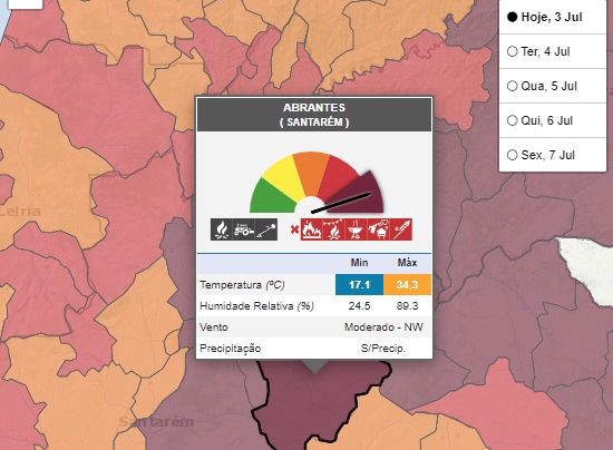 O perigo de incêndio, determinado pelo IPMA, tem cinco níveis, que vão de reduzido a máximo e os cálculos são obtidos a partir da temperatura do ar, humidade relativa, velocidade do vento e quantidade de precipitação nas últimas 24 horas.