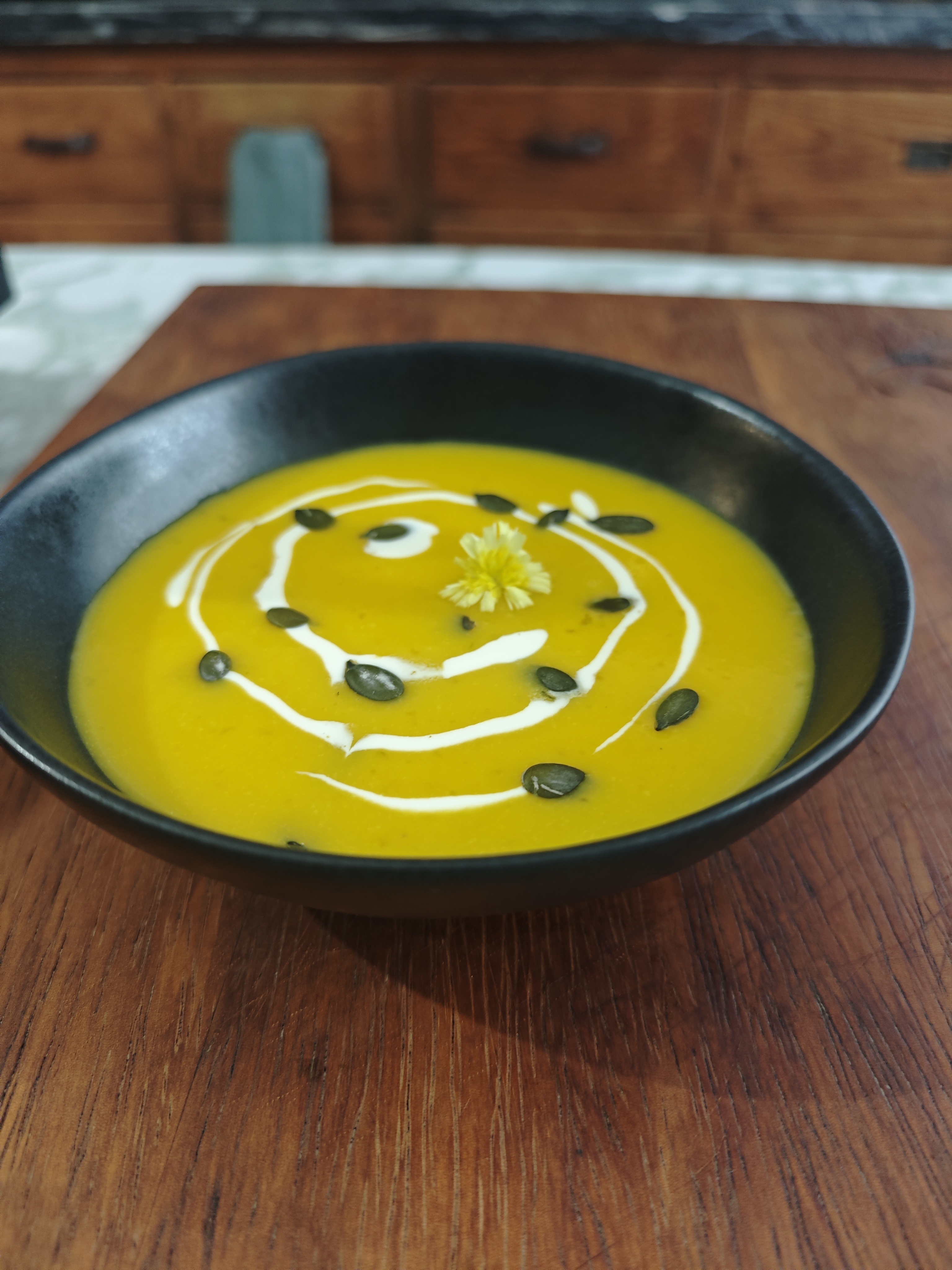 Servir o creme bem quente, regado com um fio de natas vegetais e polvilhado com sementes de abóbora tostadas.