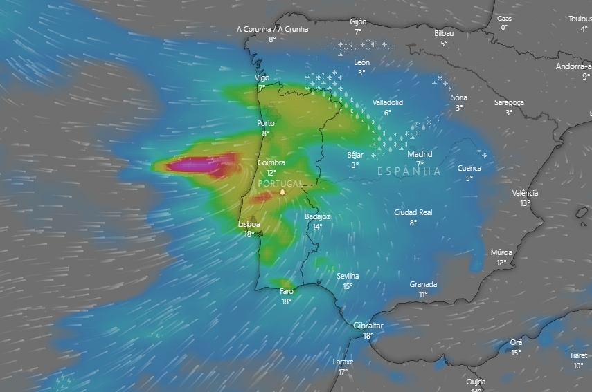 IPMA Doze distritos de Portugal Continental sob aviso amarelo devido a chuva, vento e neve