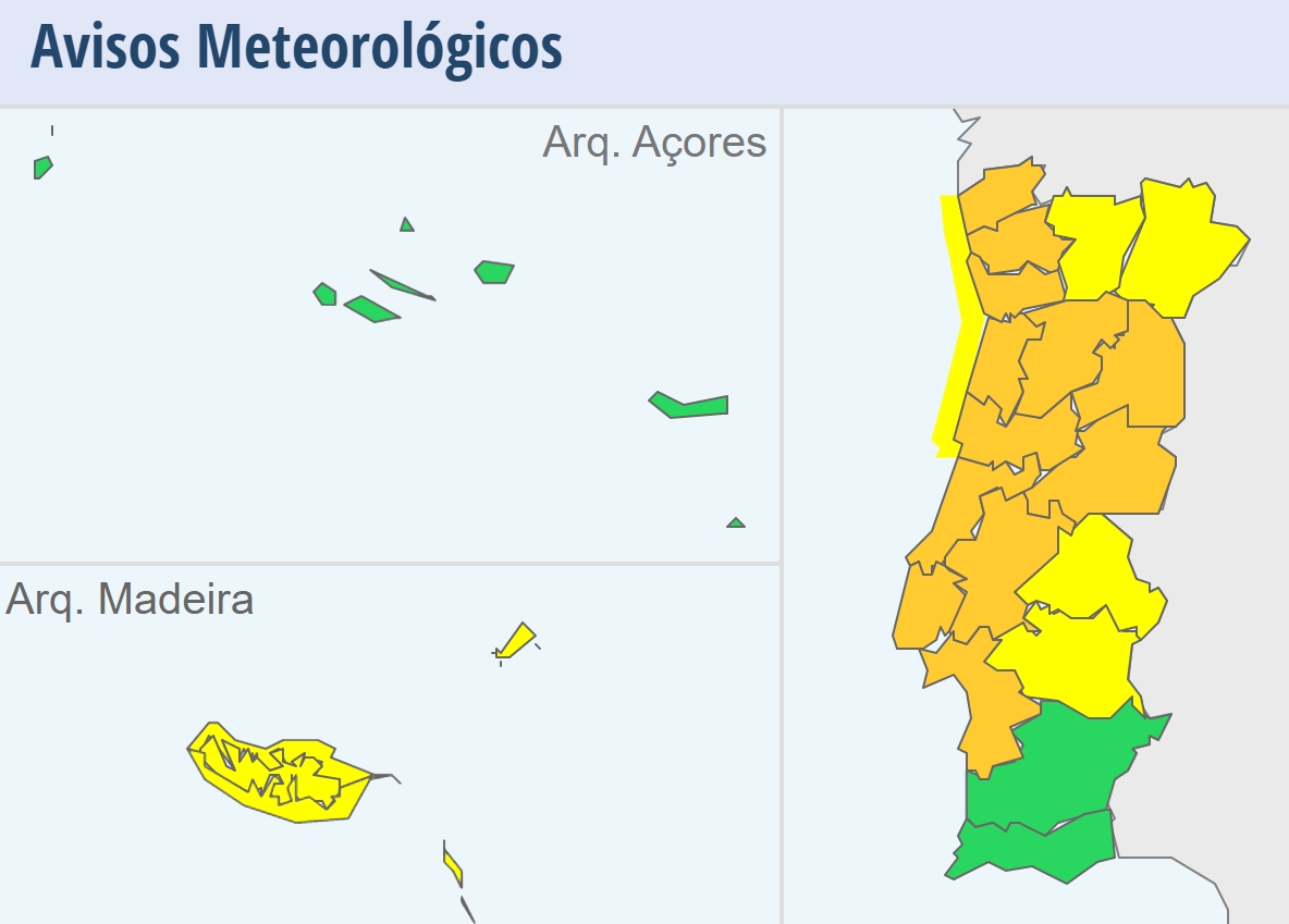 Entre as 06:00 e as 12:00, de domingo, estarão sob aviso laranja os distritos de Castelo Branco e Guarda e das 00:00 às 06:00 os distritos de Aveiro, Coimbra e Leiria.