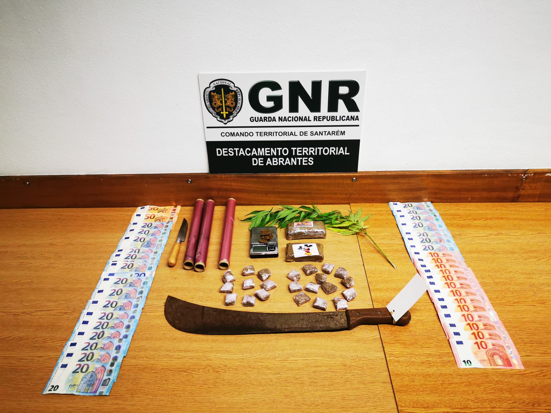 No âmbito de uma investigação por tráfico de estupefacientes que decorria há um ano, os militares da Guarda realizaram diversas diligências policiais no decorrer das quais foi possível apurar a identidade dos suspeitos envolvidos no tráfico de produtos estupefacientes. No seguimento da ação foi dado cumprimento a um mandado de busca domiciliária, o qual culminou com a detenção dos suspeitos e com a apreensão de 665 doses de haxixe, uma planta de canábis, diverso material de pesagem, corte e armazenamento de produto estupefaciente, 770 euros em numerário e uma catana.