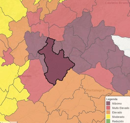 Neste nível de risco está uma faixa de concelhos do Médio Tejo e Beira, nomeadamente Abrantes, Constância, Mação, Sardoal, Tomar e Vila Nova da Barquinha, no distrito de Santarém, Gavião e Nisa, no distrito de Portalegre, e Proença-a-Nova, no distrito de Castelo Branco.