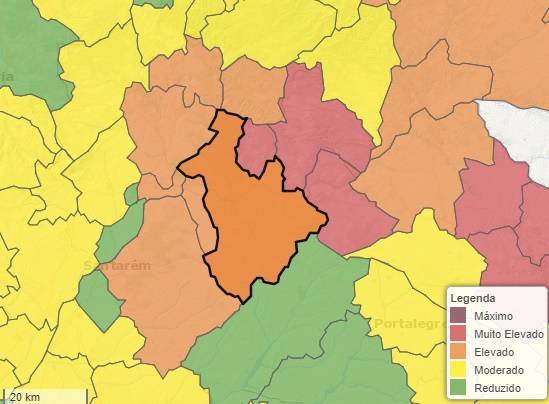 Em risco elevado o IPMA colocou mais de 40 municípios dos distritos de Bragança, Vila Real, Viana do Castelo, Braga, Viseu, Guarda, Castelo Branco, Portalegre, Santarém, Beja e Faro. Neste nível estão os concelhos de Mação e Sardoal, no distrito de Santarém, e ainda Gavião, no distrito de Portalegre.