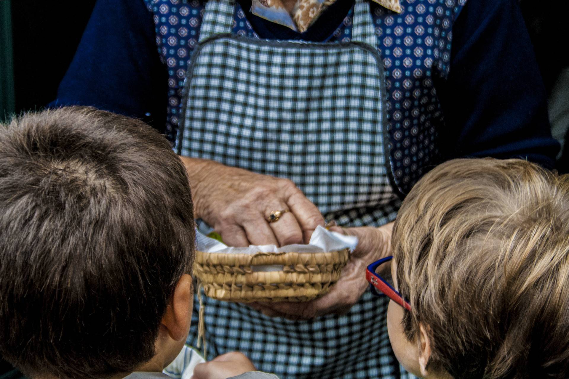Depois, no dia 1, pedindo “Bolinhos, bolinhos, em louvor dos santinhos” ou "Pão-por-Deus", dependendo da terra, as crianças recebem broas, bolos, romãs e frutos secos, rebuçados, amêndoas ou dinheiro, que colocam dentro dos seus sacos de pano.
