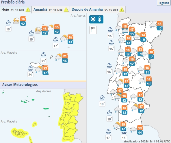 Também o arquipélago da Madeira está com aviso amarelo por causa da agitação marítima, a partir das 09:00 de hoje e até às 00:00 de sexta-feira.
