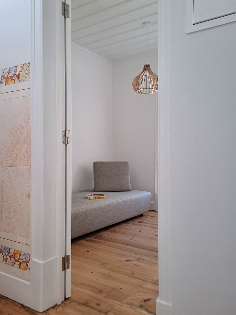 Foi à entrada no edifício, totalmente recuperado e devolvido à vida, que somos guiados pela intervenção que foi feita.