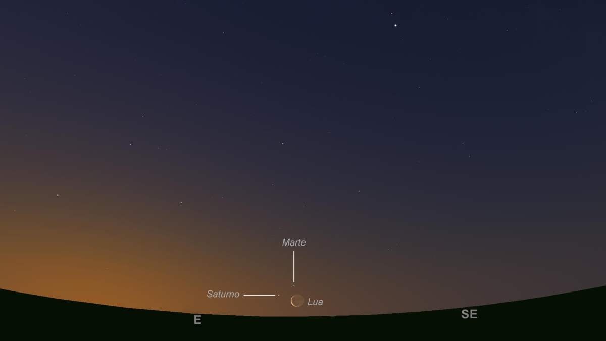 Dia 8 o nosso satélite atinge a fase de lua nova. Dia 10, um muito fino crescente da Lua passa a 3 graus de Júpiter, ao anoitecer. No dia seguinte, os planetas Marte e Saturno estarão em conjunção, separados por apenas meio grau!