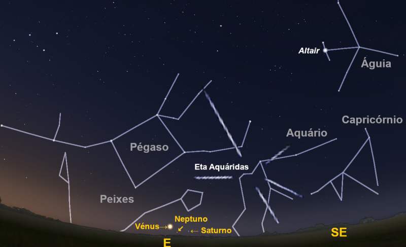 Já na madrugada de dia cinco terá lugar o pico de atividade da chuva de estrelas Eta Aquáridas. Ao acompanhar o movimento destes meteoros, ficaremos com a sensação de que todos provêm de uma parte a abóbada celeste (o radiante) muito próxima a da estrela Eta da constelação do Aquário, uma estrela situada a cento e sessenta e oito anos-luz de nós. No entanto a origem destas rochas e poeiras está muito mais próxima de nós, visto serem restos que o cometa Halley foi perdendo ao longo da sua órbita. As estimativas mais otimistas sobre o número de meteoros espectável aquando do pico de atividade das Eta Aquáridas rondam a meia centena de meteoros por hora. Mas tais estimativas são feitas assumindo condições de observação ideais. Em particular, assumindo que o radiante da chuva de meteoros se encontra imediatamente acima das nossas cabeças, o que não será o caso.