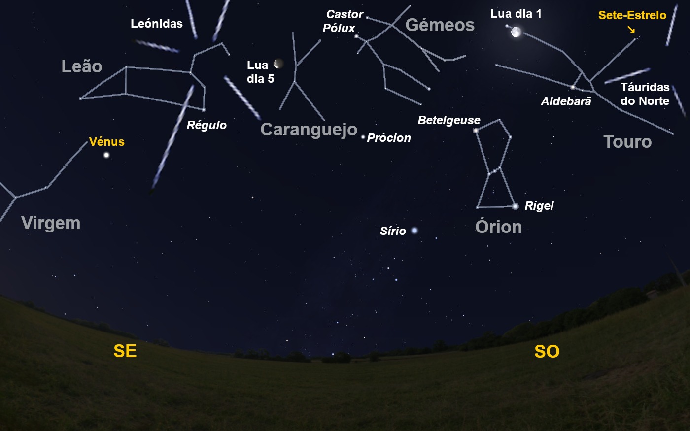 Na manhã de dia cinco dar-se-á o quarto minguante ligeiramente à direita da constelação do Caranguejo. No entanto, dada a fase da Lua em questão, apenas assistiremos ao seu nascimento aquando da mudança do dia. Nesta mesma madrugada de dia seis terá lugar o pico de atividade da chuva de estrelas que parecerão surgir de um ponto da estrela celeste (o radiante) situado junto ao dorso da constelação do Touro: as Táuridas do Sul. Passada uma semana iremos deparar-nos com o pico de outra chuva de meteoros com o radiante localizado ligeiramente mais acima, daí esta chuva de estrelas ser chamada de Táuridas do Norte. Enquanto no primeiro evento é originado por restos do cometa 2P/Encke, o segundo tem origem no asteroide 2004 TG10 (objeto com órbita próxima da Terra). Independentemente desta diferença, ambas chuvas de meteoros são particularmente fracas sendo espectável que mesmo aquando do pico de atividade não se chegue a ver meia dezena de meteoros por hora.
