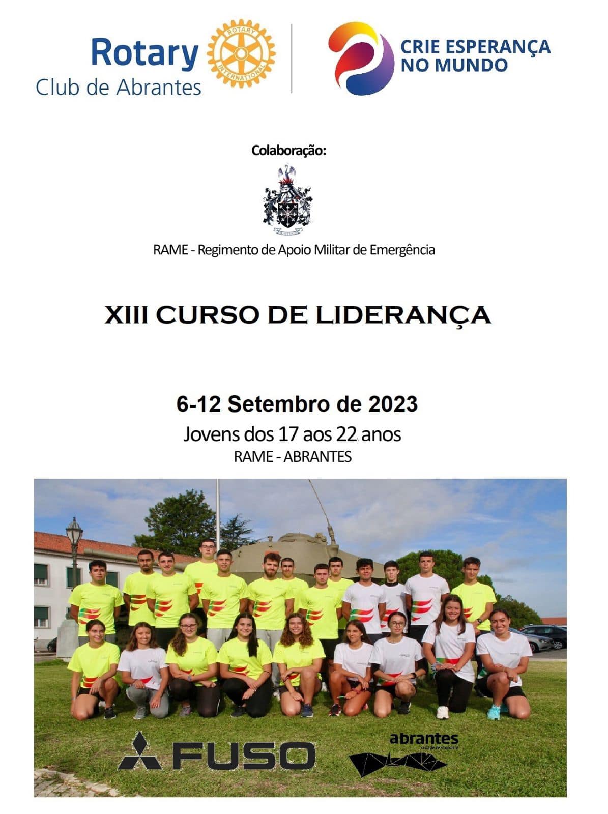 Está a decorrer o XIII Curso de Liderança, organizado pelo Rotary Clube de Abrantes (RCA), em pareceria com o Regimento de Apoio Militar de Emergência (RAME). Assim, este encontro, que está destinado a jovens entre os 17 e 22 anos, iniciou no dia 6 de setembro e vai realizar-se até dia 12 de setembro. De referir que os jovens irão ficar a dormir no RAME dias em que decorre este encontro.