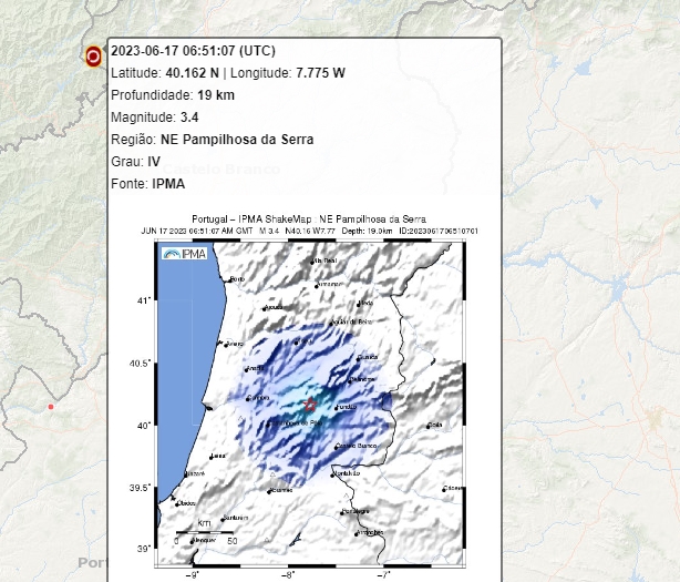 Segundo o Instituto Português do Mar e da Atmosfera (IPMA) o abalo foi registado pelas 07:51, sendo o epicentro localizado perto de 20 quilómetros Este-Nordeste da Pampilhosa da Serra.