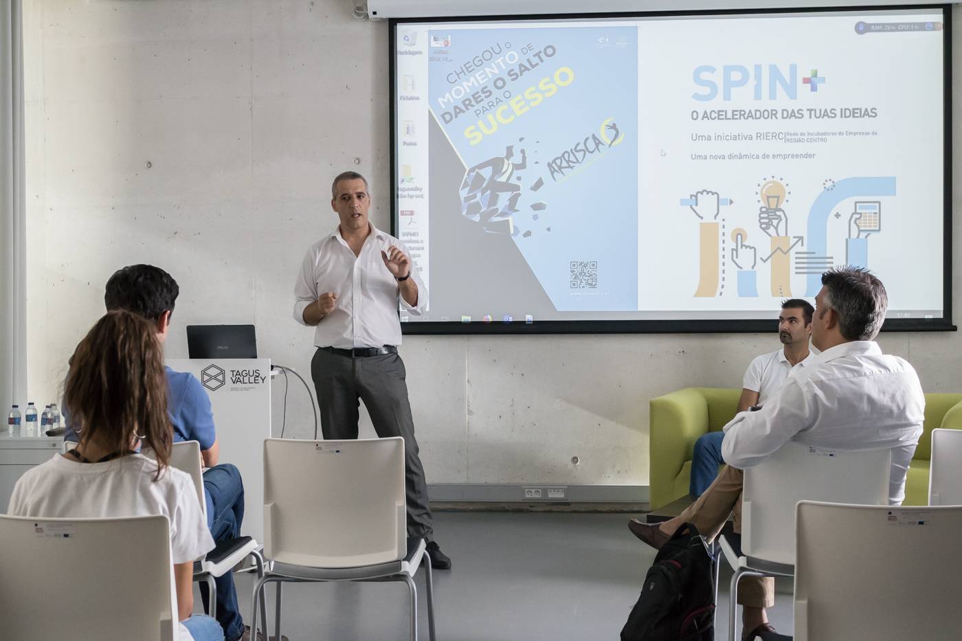 A ação contou com a intervenção de Paulo Santos, da RIERC - Rede de Incubadoras de Empresas da Região Centro, que apresentou o acelerador de ideias de base tecnológica e criativa SPIN+.