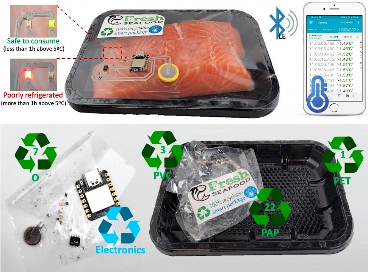 «Para já, os adesivos criados contam um sensor de temperatura que mede a temperatura (TºC) da embalagem e que avisa o utilizador quando existe risco de contaminação. Esta solução tem um custo de produção baixo, pelo que no futuro será viável incluir estes adesivos nas embalagens de bens perecíveis para controlar a sua qualidade. Neste momento, é possível monitorizar a temperatura da embalagem e exposição a condições desfavoráveis, mas contamos conseguir no futuro controlar outros fatores como a pressão, humidade, posição, ou localização», revela.